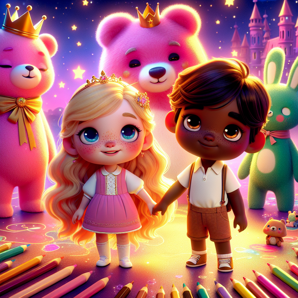في يوم مشمس على شاطئ الشمس، حيث كان الرمال دافئة والرياح تداعب بلطف، كان يعيش الأمير القرصان الدب، وهو دب شجاع يرتدي تاجًا ذهبيًا وعصابة عين قرصان وردية زاهية. كان يحب حماية مملكته باللطف والعناق. في هذا اليوم، لاحظ الأمير القرصان الدب شيئًا غريبًا. النجوم في السماء بدأت تخفت! كان يراقبها طوال الليل.