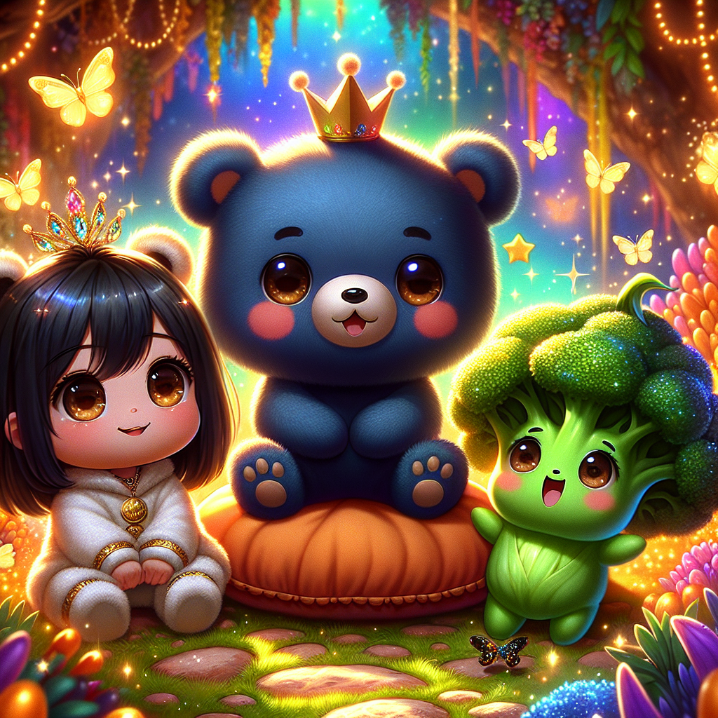 Jeden Tag begann Bearon mit einer Tasse Honigtee und einem kleinen Gebäck. "Heute wird das Wetter... sehr flauschig!", sagte er, als er sein Fell betrachtete. Dann bereitete er alles für eine Tee-Party vor. Er lud alle seine Freunde ein: die kleinen Drachen, die Glitzerkäfer und sogar die schüchterne, aber liebevolle Fledermaus. Aber heute war etwas anders, denn Sprout, der Weltraum-Brokkoli, landete plötzlich in der Höhle! Sprout war ein grüner, supermutiger Brokkoli mit einem Umhang aus unzerstörbarem Salat. Er war auf einer Mission, Gemüse spaßig zu machen.