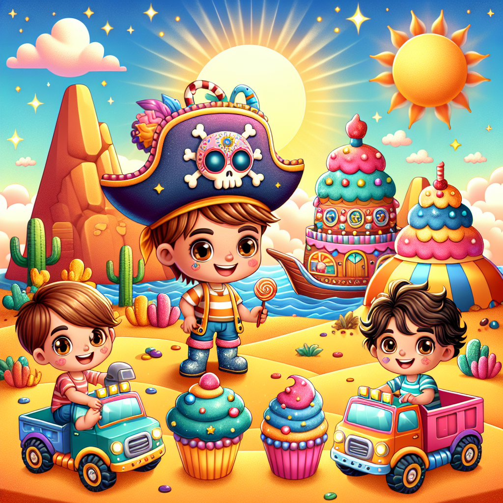 Am Rande einer strahlenden Wüstenoase, wo die Sonne goldene Sanddünen küsste, landete ein ganz besonderes Schiff. Es war kein gewöhnliches Schiff, sondern ein leckeres, aus Cupcakes gebautes Schiff, das von Captain Pompom gesteuert wurde. Captain Pompom war ein Anblick! Ihre Stiefel glitzerten wie Sterne, ihre Haare waren mit kleinen bunten Schleifen verziert und ihre Augen funkelten vor Abenteuerlust. "Ahoi, Matrosen!" rief Captain Pompom mit fröhlicher Stimme. "Wir sind hier, um einen Schatz zu finden!"