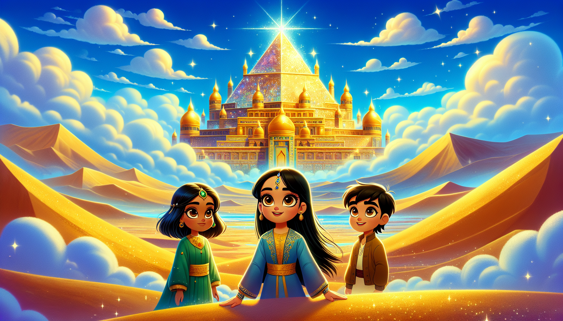 Once upon a time, in a land where the golden sands stretched as far as the eyes could see, there was a magical pyramid. This wasn't just any pyramid; it was the Pyramid Palace, where the walls shimmered like a thousand jewels under the sun.