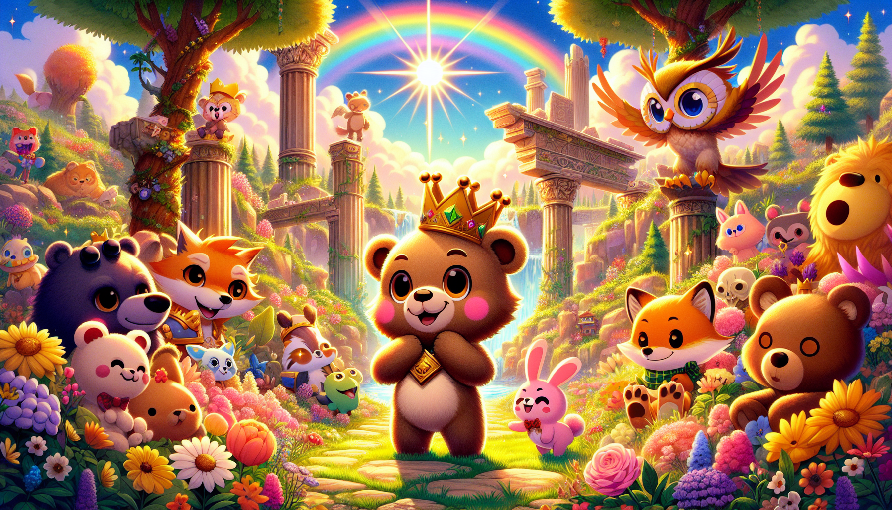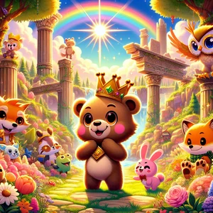 Once upon a time, in the heart of a magical land filled with ancient ruins, lived a noble bear named Bearon the Royal Fluff. Bearon wore a shiny golden crown that glittered like a thousand fireflies and ruled the land with fairness, snuggles, and the best tea parties anyone had ever seen.