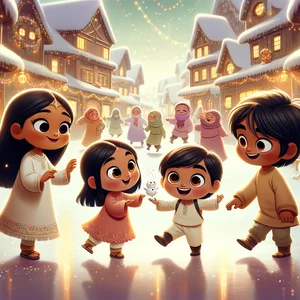 Once upon a time, in a quiet, snowy village nestled between towering mountains, three delightful little friends named Sitara, Jahaan, and Azal were bundled in their coziest scarves and mittens. The snow sparkled like diamonds under the sun, and everything looked like it had been dipped in a pot of white icing.