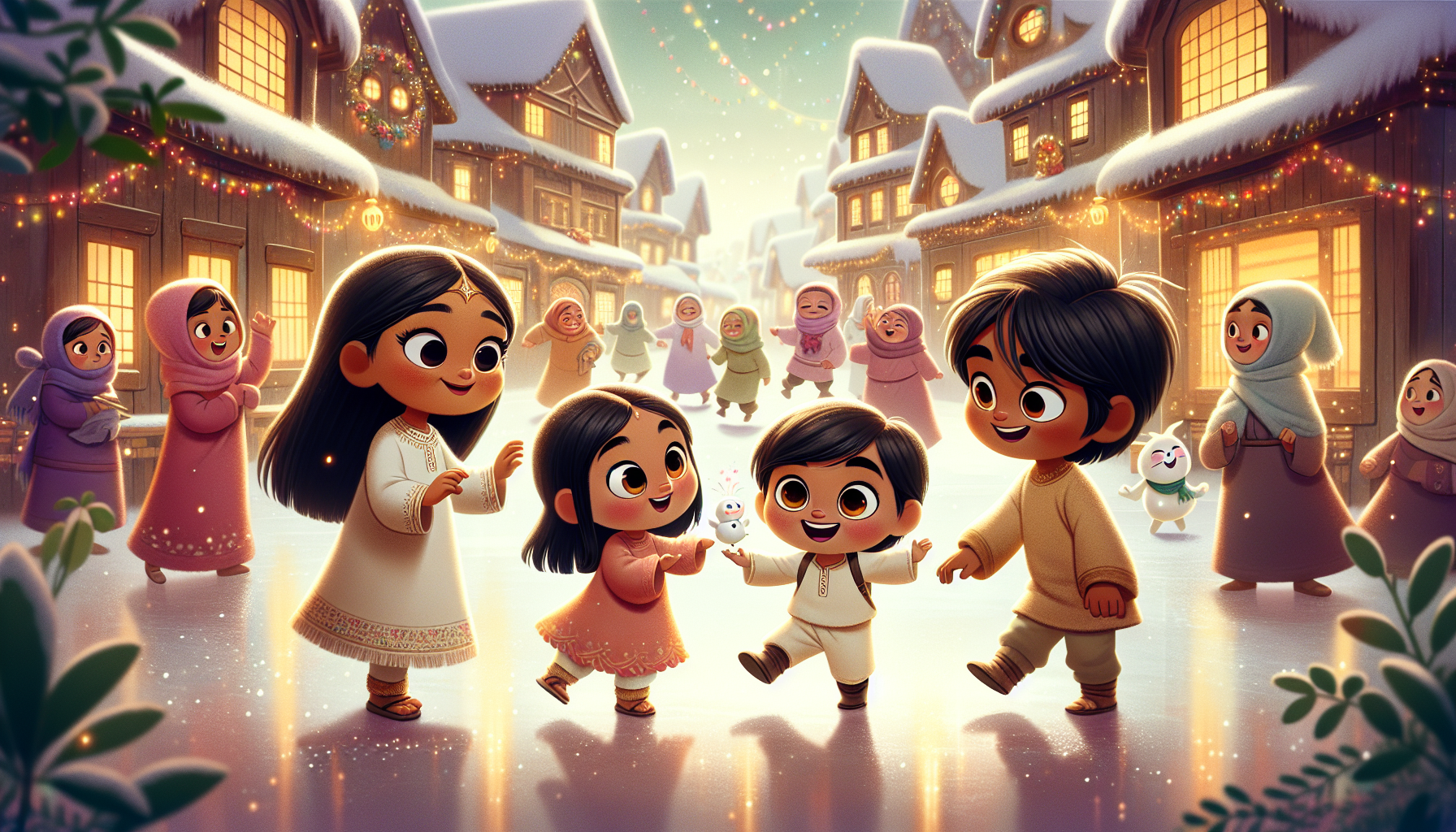 The children excitedly nodded. At the festival, they learned a special dance that the villagers performed every winter. Sitara led the way, her feet twirling in the snow as she taught Jahaan and Azal the steps. Blinky watched, happily bouncing in the background.
