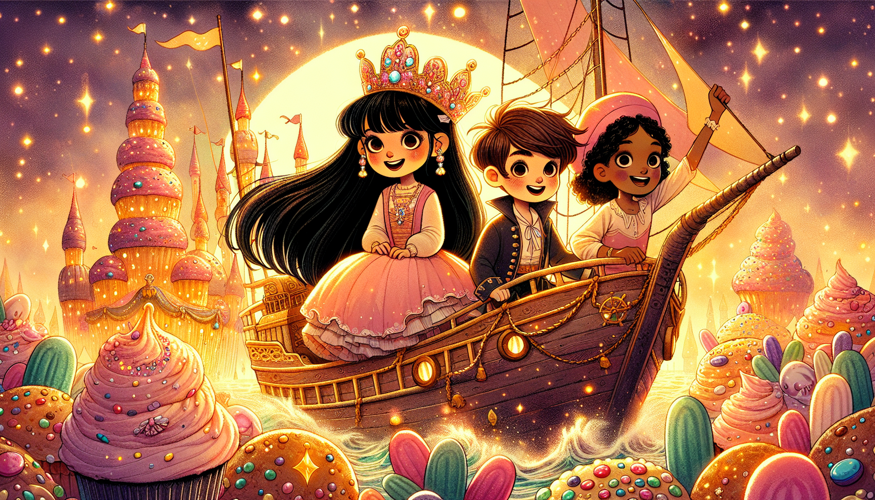 Onboard the cupcake ship, the three children marveled at decorations made from frosting flowers and jellybean jewels. Captain Pompom set sail across the meadow, toward the secret isle where the crown was said to be hidden.