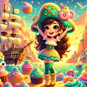 On the bluest, bubbliest ocean you ever did see, lay a tiny island called Hidden Island. It wasn't on any regular maps, and that's just how the islanders liked it. And on this island lived a pirate unlike any other: Captain Pompom. She wasn't your typical pirate with a gruff voice and a menacing scowl. Oh no! Captain Pompom had boots that sparkled brighter than a disco ball, made of the finest, shiniest green and yellow glitter. Her ship, the most magnificent vessel in all the seven seas, was called the Cupcake Cruiser. It looked exactly like a giant, frosted cupcake, complete with rainbow sprinkles and cherry on top. "Hooray for frosting!" Captain Pompom would often cheer. "It's waterproof, you know!" she'd explain with a wink, her voice as cheerful as a school bell. Her most prized possession, besides her sparkly boots, was her treasure map. But this wasn't any ordinary map. It was made of the tastiest, most delicious edible paper, smelling faintly of vanilla and cinnamon. Captain Pompom had a special secret, too: with a special cheer, she could make almost anything sparkle! This made her the most enthusiastic and encouraging pirate captain around, always ready for a dance-off, which she had never lost. Her belief in a good cheer and a positive attitude was as strong as the sturdy frosting holding her ship together.