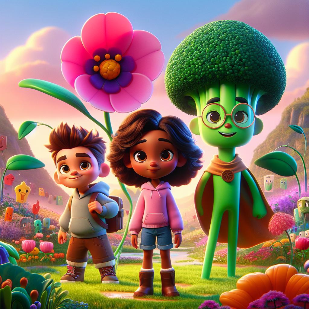 Once upon a time, in a Peaceful Meadow, lived a deep pink forest sprout named Clover. Clover loved to giggle, especially when the sun tickled their leaves. And their leaves? They glowed in the dark! Each day, a new, lovely flower would bloom on top of their head. In the Peaceful Meadow, where the birds sang soft music, Clover was best friends with Sprout the Space Broccoli. Sprout was a dark turquoise, super brave broccoli with a cape made of indestructible lettuce. Sprout’s mission? To make veggies fun! Sprout had super strength when near other vegetables and could talk to all the other vegetables, telepathically of course.
