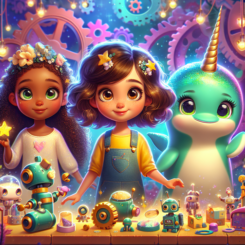 In the heart of a land filled with whirring gears and sparkling lights, stood the Robot Factory. The air smelled of sweet oil and the sounds of cogs turning filled every corner. Inside, colorful robots bustled about, their metallic bodies gleaming under the bright factory lights. They were always dancing, always singing, and having fun, especially Camila, who loved to sing and dance to the music the factory produced. But something was amiss. The factory's music was beginning to sound a bit… off. That’s when Noodle the Narwhal Knight arrived. Noodle was a brave sea friend with a green body and a shiny helmet made from enchanted seashells. His horn, which glowed when near treasure, was famous throughout the land. Noodle received a message, delivered by a speedy little robot messenger named Zip: "The music gears are missing! The music is gone!" Zip zoomed around in circles, the message flashing on his screen.