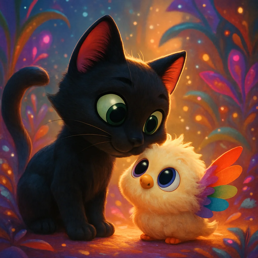 With the last piece of fluff tucked into place, the home was complete! It was a perfect, small dome, snug and warm, bathed in the gentle glow of the glow-worm. The rainbow-winged creatures, no longer chirping sadly, snuggled into the moss and fluff, their tiny wings tucked neatly against their bodies. A chorus of happy, contented squeaks filled the air. Pepper watched them, a deep, satisfying warmth spreading through her chest, a feeling more profound and joyful than any discovery of a hidden fish treat. The glow-worm’s light softened, casting a peaceful glow, and the bluebird trilled a soft, sleepy song. The other animals, standing nearby, felt it too – this quiet joy of helping, of creating something good together. They looked at each other, understanding dawning in their eyes: even though they were all so different, they could work together. They could build something wonderful. Pepper, feeling a content weariness, curled up just outside the entrance to the new home, her emerald eyes watching over her new friends as they drifted off to sleep. Hidden Island, already a magical place, now felt even more so, a testament to the quiet power of kindness and the extraordinary homes that empathy could build. Pepper purred, a soft, rumbling sound that blended with the sleepy chirps, filling the air with a sense of peace and belonging.