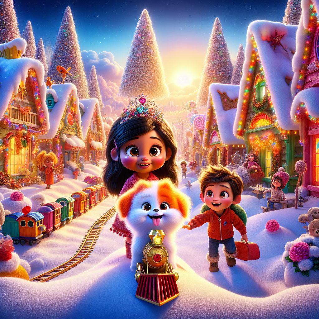 In the heart of the Snowy Village, nestled among sparkling snow-covered houses, lived Sunny the Cloud Pup. Sunny wasn't just any pup; they were a fluffy ball of orange-red fur made of cotton candy clouds, whose barks sounded like tiny bells. Wherever Sunny bounced, sunshine followed, chasing away the winter chill. The village children loved Sunny, especially Azal, a little girl with a crown, who adored puppies and always carried a bright red bag filled with her favorite shoes.