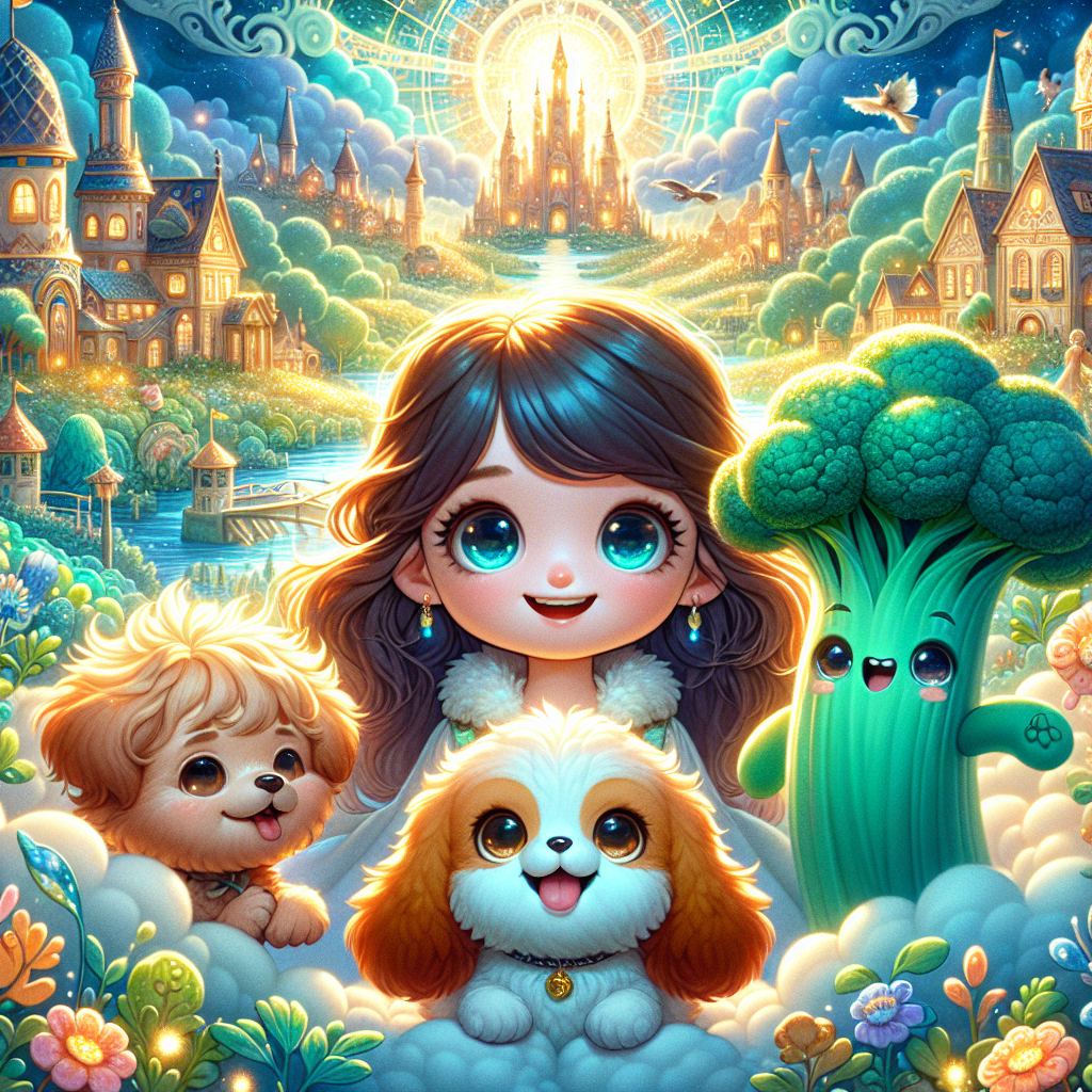 One sunny morning, as Sunny was bouncing through the clouds, a tiny bell-like bark escaped their fluffy muzzle. "Where have all the rainbows gone?" Sunny wondered, their rainbow trail momentarily fading. They knew something had to be done! Sunny zipped down to the kingdom, their cotton candy fur practically glowing with concern. It was there they met Sprout the Space Broccoli. Sprout was a dark turquoise, super brave, and on a mission to make veggies fun! They stood tall and proud, wearing a cape made of indestructible lettuce.