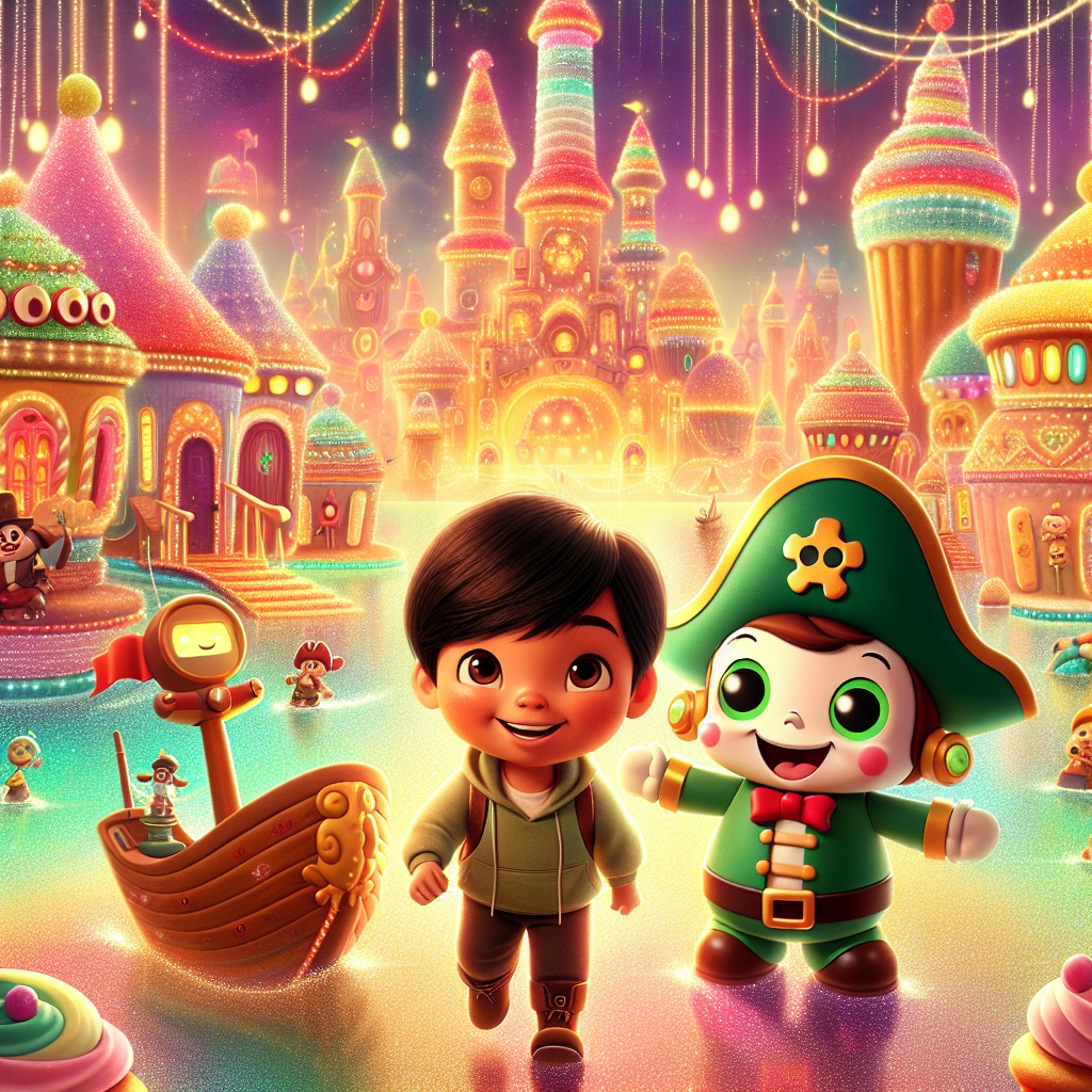 Boop explained his mission with a series of beeps and boops, which Captain Pompom understood perfectly. She loved anything sparkly, and the thought of rescuing a dream sparkle made her clap her hands with glee. Her ship, made of frosting and gingerbread, looked like a magnificent castle. Towers of gumdrop and candy canes formed the masts, and the sails were made of giant marshmallows. She had a map made of edible paper. "A sparkly mission? Count me in!" she exclaimed. "We'll find that dream sparkle together!"