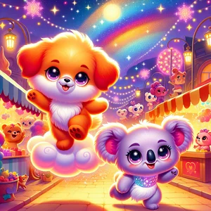 Amidst this joyful scene bounced Sunny the Cloud Pup, a fluffy ball of orange-red fur that looked like it was spun from the softest cotton candy clouds. Sunny’s tail wagged so hard, it left a shimmering trail of rainbows in its wake. With every happy leap, Sunny left little puffs of sunshine that seemed to follow her, warming everyone she passed. Sunny’s barks sounded like a cascade of tiny bells, a sweet melody that added to the festival’s charm. "Oh, what a lovely day!" Sunny chimed, bouncing towards a colorful tent.