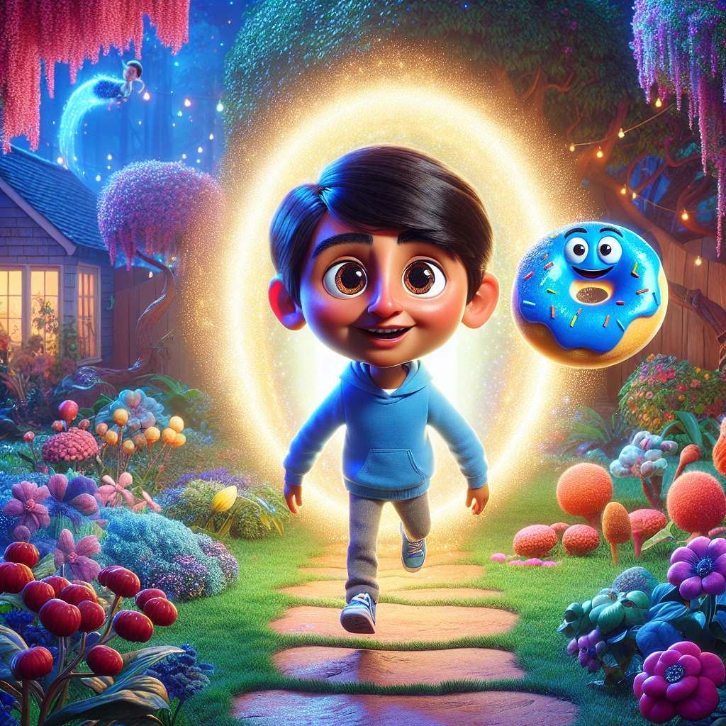 Suddenly, he was no longer in his backyard. Instead, he was standing in the most extraordinary place he'd ever seen. Flowers, bigger than his head, glowed with all the colors imaginable. Trees were not just green, but giggled with a sound like wind chimes. And the air… oh, the air was filled with the sweet scent of cotton candy and the faintest sound of a 'whoop'! In the center of this magical place floated a dodger-blue donut, spinning gracefully in the air. This was no ordinary donut; it had a hole in the middle – a portal, just like the one Aryaveer had stepped through. It was Dizzy, and her sprinkles were a dazzling rainbow.