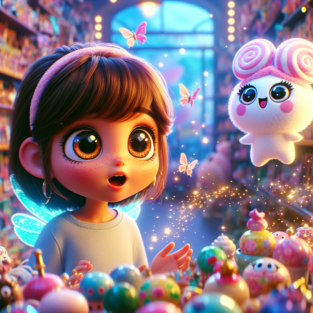One sunny afternoon, Kiana skipped through the automatic doors, her eyes wide with wonder. The store was a kaleidoscope of colors! Rainbow-colored unicorns pranced on display, and a melody of laughter filled the air. In one corner, Princess Luma, with her deep pink swirly hair, was chatting with a flock of butterflies, her hair shifting to a gentle blue as she listened intently. "Oh, you poor dears," she whispered, "it's never fun to be lost." Mimi the Marshmallow Fairy, no bigger than Kiana's thumb, flitted around, sprinkling sugar sparkles wherever she went, offering wishes to anyone who needed a little extra sweetness in their day. Her house, a tiny teacup, sat perched on a shelf filled with fluffy, marshmallow-flavored clouds.
