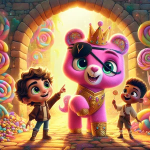 As they continued, they encountered obstacles, but they worked together, Kiki’s horn could turn anything into candy for one hour. After a while, they arrived at a chamber that was dark. "This must be where the treasure lies," Kiki said, her horn glowing faintly. "But how do we find it?" Prince Pirate Bear looked at the riddle. He remembered the last part: "Find the crown that lights the way." Then, it clicked! His golden crown! He took off his crown, and the chamber lit up. The treasure wasn’t gold or jewels, but a collection of colorful sparkling gems, each one glowing with a different light. "Wow!" exclaimed Kiki, "These are amazing!" The gems shone, casting a warm glow across the chamber. "This is much more valuable than gold," Prince Pirate Bear said, gazing at the gems, "they represent friendship, kindness, and the joy of sharing."