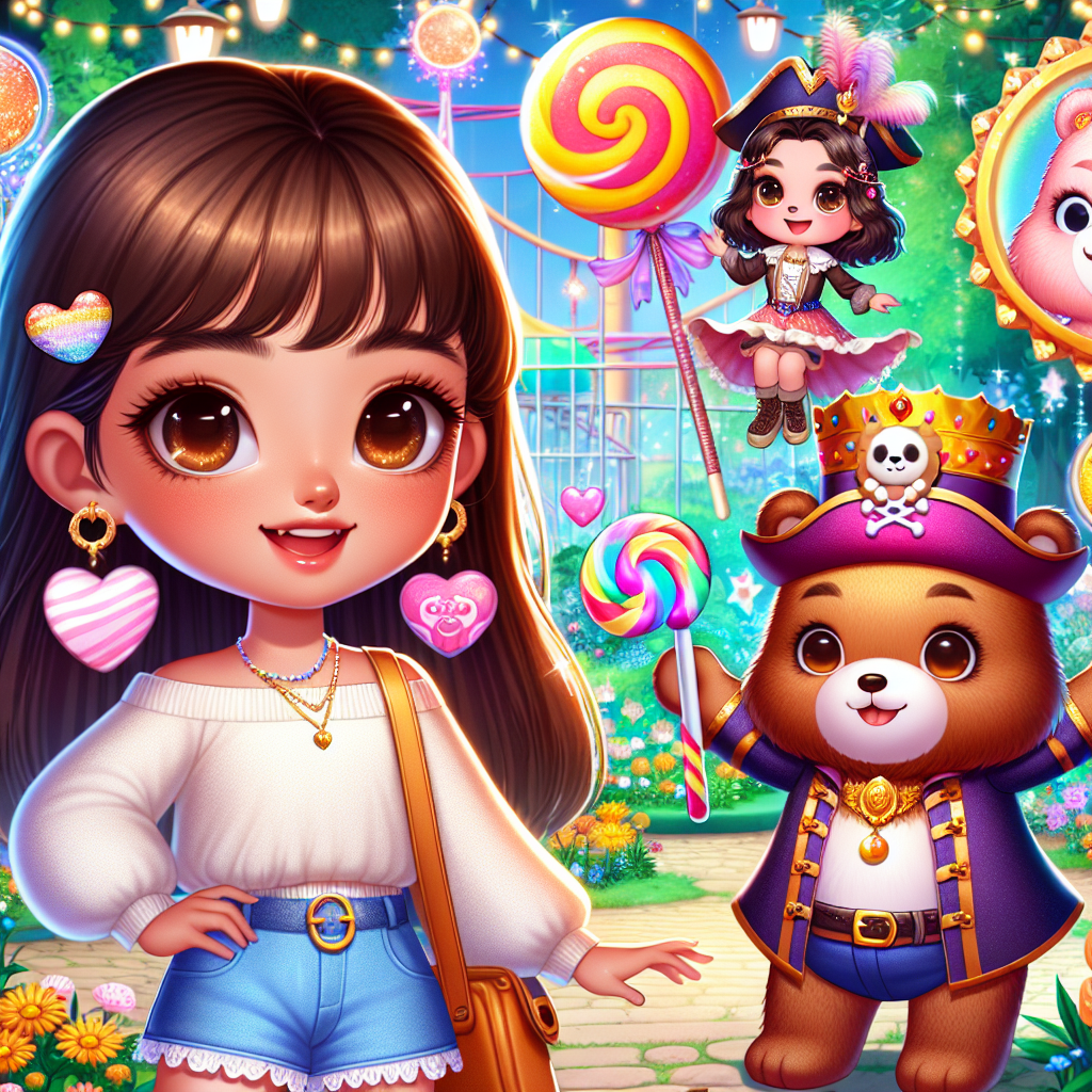 As Kiana tiptoed through the quiet pathways, the air shimmered with anticipation. Finally, she reached the Enchanted Enclosure. It was a beautiful, secret garden, aglow with soft, twinkling lights. Inside, she saw the most amazing sight: Prince Pirate Bear, a brave bear wearing a golden crown and a pirate eyepatch, and Bearon the Royal Fluff, a fluffy, noble bear with a magnificent crown. They were having a tea party! Tables were laden with honey cakes, and tiny flags fluttered in the gentle breeze. A moment later, a pink blur zoomed in, and landed beside them: Peachy the Lollipop Witch, riding a fizzy soda broomstick. Her hat was a giant swirled lollipop, and her dress shimmered with candy sprinkles. “Welcome, welcome!” Peachy announced in a high-pitched, cheerful voice. “Would you like some honey tea?”