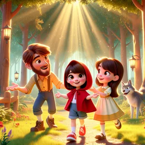 Suddenly, they met Little Red Riding Hood. She was skipping along a path, carrying a basket overflowing with delicious treats. “Hello!” she said, her voice as bright as the berries she carried. "I'm on my way to Grandma Jill's house with goodies!" Little Red Riding Hood had a song for every occasion and began to sing a song about the Whispering Woods. They danced together, showing off their best moves! Kiana would have loved the dance.