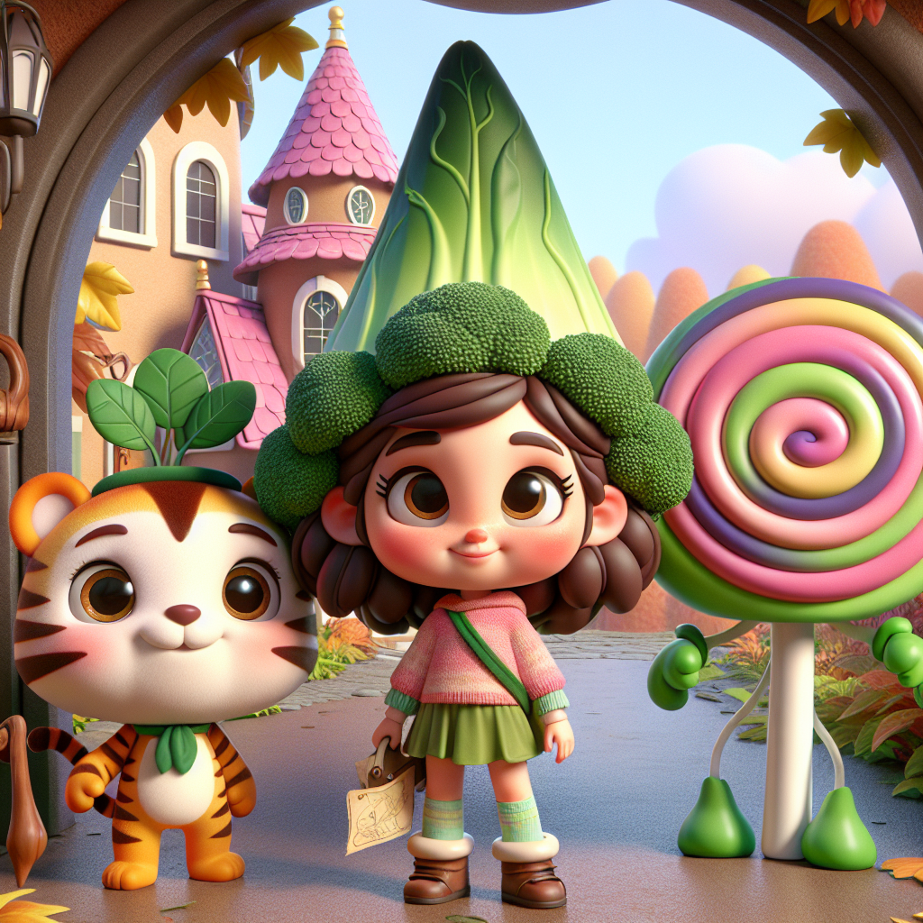 Before Tiko could respond, a shadow fell over them. A towering figure emerged from the trees: Sprout the Space Broccoli, a super-brave vegetable hero, with a cape of indestructible lettuce and a dark turquoise glow. “Greetings, friends!” Sprout boomed, his voice a cheerful rumble. “I'm here to make vegetables fun, and rumor has it, the Mansion of Merriment has the most joyous garden this side of the galaxy!”