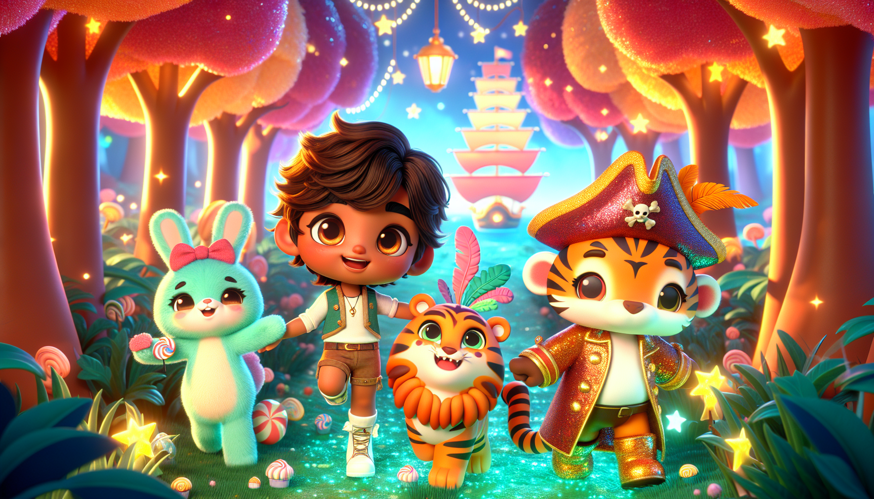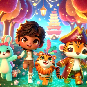 Just then, a tiger wearing a leaf hat peeked out from behind a bush. "Hey there! I'm Tiko the Jungle Explorer Tiger," the tiger introduced himself with a smooth, energetic tone. "I have a treasure map, and I’m on a quest to find the lost giggle gem. It’s hidden somewhere in the kingdom and can make anyone giggle forever!"