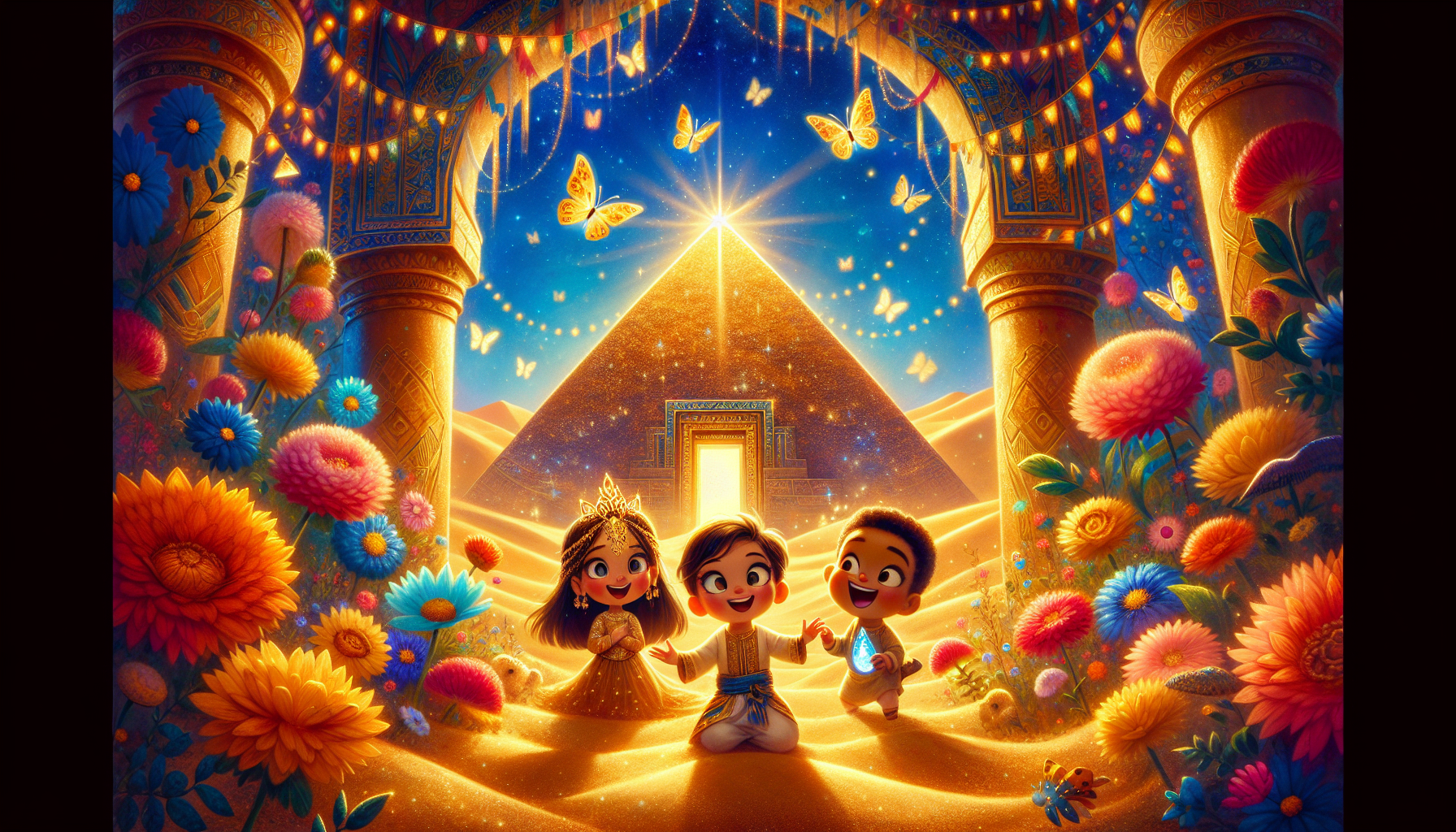 Once upon a time, in the land of golden sands and ancient secrets, stood a grand and mysterious pyramid. It sparkled under the sun like a giant, dusty diamond. No one quite knew what lay inside, for the entrance was hidden behind a magical door that could only be opened by the bravest and kindest of hearts.
