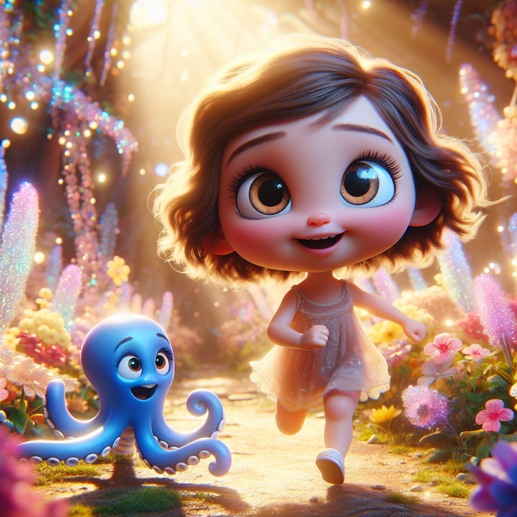 Zoe, surprised but also curious, giggled. "I'm Zoe!" she said. "This place is so pretty!" Wobble wiggled his tentacles, each one dancing to a different rhythm. "It is! And it's even better with friends. Want to dance?" He stretched himself, showing off his ability to grow ten times his normal size. Zoe clapped her hands. "Yes, please!"