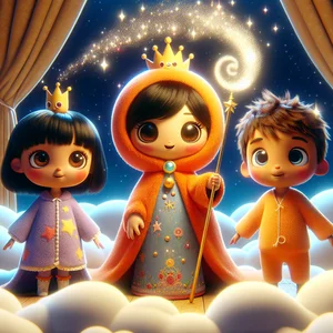 Once upon a time, far above the sparkling blue ocean, were the Floating Islands. They drifted lazily among the clouds, and each island was special. But the most magical of all was Napland, the land of endless naps, ruled by the kind Queen Snoozle. Queen Snoozle was a sight to behold! She wore a big, fluffy blanket cape, the color of a juicy orange, and a crown made of soft, fluffy Dream Clouds. Whenever Queen Snoozle waved her scepter, a gentle shower of sleep dust would fall, and everyone felt sleepy and happy. She had just woken up from a very long sleep, a whole one hundred years! She felt so refreshed and ready for a big celebration.