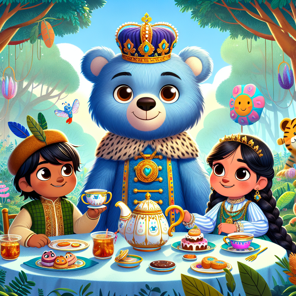 Deep within a place called the Whispering Woods, where trees wore hats made of leaves and giggling mushrooms popped up like confetti, lived a fluffy blue bear named Bearon the Royal Fluff. Bearon wasn’t just any bear; he was a noble ruler with fur as soft as a cloud and a crown that sparkled with stardust. He was famous for his amazing tea parties, where the tea cups danced, and the honey dripped straight from his royal scepter, which also doubled as a honey dipper.