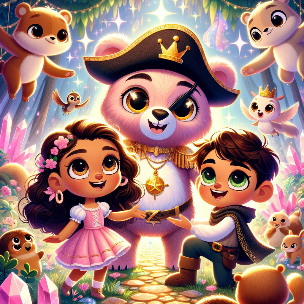 Deep inside a sparkling cave, nestled among shimmering crystals, lived Prince Pirate Bear. He wasn't just any bear; he was a brave bear with a golden crown perched on his head and a pirate eyepatch over one eye. The cave walls were painted in a dazzling hot pink, his favorite color! His home wasn't just a cave; it was a royal lair, filled with treasures and, most importantly, love. Prince Pirate Bear had a remarkable collection of 37 different crowns, each with its own story and sparkle. He adored honey tea, brewed with the finest honey from his woodland friends. And speaking of friends, Prince Pirate Bear had a special gift; he could speak to all the woodland creatures! He often chatted with the squirrels, the deer, and the fluffy bunnies, sharing stories and secrets.