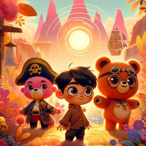High atop the Pink Peak, where the sky was always a cheerful shade of blue, lived Prince Pirate Bear. He was no ordinary prince; he wore a bright, hot pink crown, a pirate eyepatch, and had a heart as golden as his favorite honey tea. He could speak to squirrels, had 37 different crowns, and once sailed across the Fluffy Sea to rescue lost teddy bears.