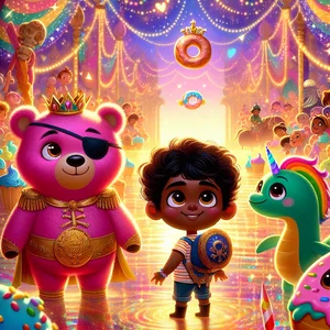On Hidden Island, where the sun always wore a smile and the sea sparkled like a disco ball, lived Prince Pirate Bear. He wasn't just any bear; he was a brave bear with a hot pink fur, a golden crown perched on his head, and a pirate eyepatch. Prince Pirate Bear had a collection of 37 different crowns, each shimmering with its own magic. His friends, Noodle the Narwhal Knight, a brave sea friend with a shiny green helmet, and Dizzy the Flying Donut, who loved to spin and sprinkle confetti, were always by his side. Noodle's horn glowed whenever treasure was near, and Dizzy's confetti changed color based on the jokes she told!
