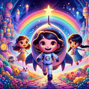 Zoe, always ready for fun, squealed, "A space rainbow? Tell us more!" Ping, though quieter, was just as curious. Rocket Pop told them all about the sparkly galaxies it had visited, full of swirling stardust and planets made of jelly. Rocket Pop explained that its power came from stardust and giggles. "And guess what? I have a secret compartment for collecting space rainbows!" Rocket Pop zipped open a small door, and Zoe and Ping gasped as they peeked inside at the rainbow-colored collection.