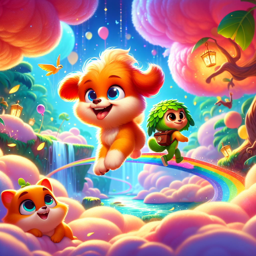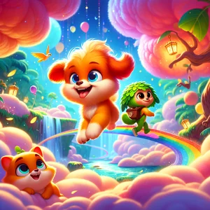 Meet Sunny, a Cloud Pup whose fur was the color of a sunset. Sunny loved to bounce! She bounced across the clouds, and every time she did, a beautiful rainbow followed. When Sunny barked, it sounded like tiny bells! "Bing, bing, bing!" Sunny would bark as she played, her tail wagging so fast it looked like a tiny helicopter. Sunny was exploring when she bumped into Tiko, a Jungle Explorer Tiger. Tiko wore a green leaf hat and carried a rolled-up treasure map. He was looking for something very special – The Lost Sparkle Gem!