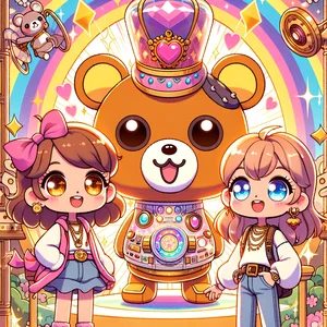 One sunny morning, Prince Pirate Bear was preparing for a journey in his time machine, a contraption that sparkled and shimmered with every tick and tock. This wasn't just any time machine; it could travel to any place and any time imaginable. Suddenly, the door to his workshop burst open, and in skipped Julia, a girl with a smile as bright as the sun, followed by Laura, her eyes sparkling with curiosity. "Prince Pirate Bear!" Julia exclaimed, "Can we have a dance party in your workshop today?" Laura nodded eagerly, "And maybe you could tell us a story?" Prince Pirate Bear chuckled, his voice a comforting rumble. "Of course, my dear friends! But first, let's see where this time machine takes us!" He winked, adding a playful "Maybe even to a dance party in the future!"