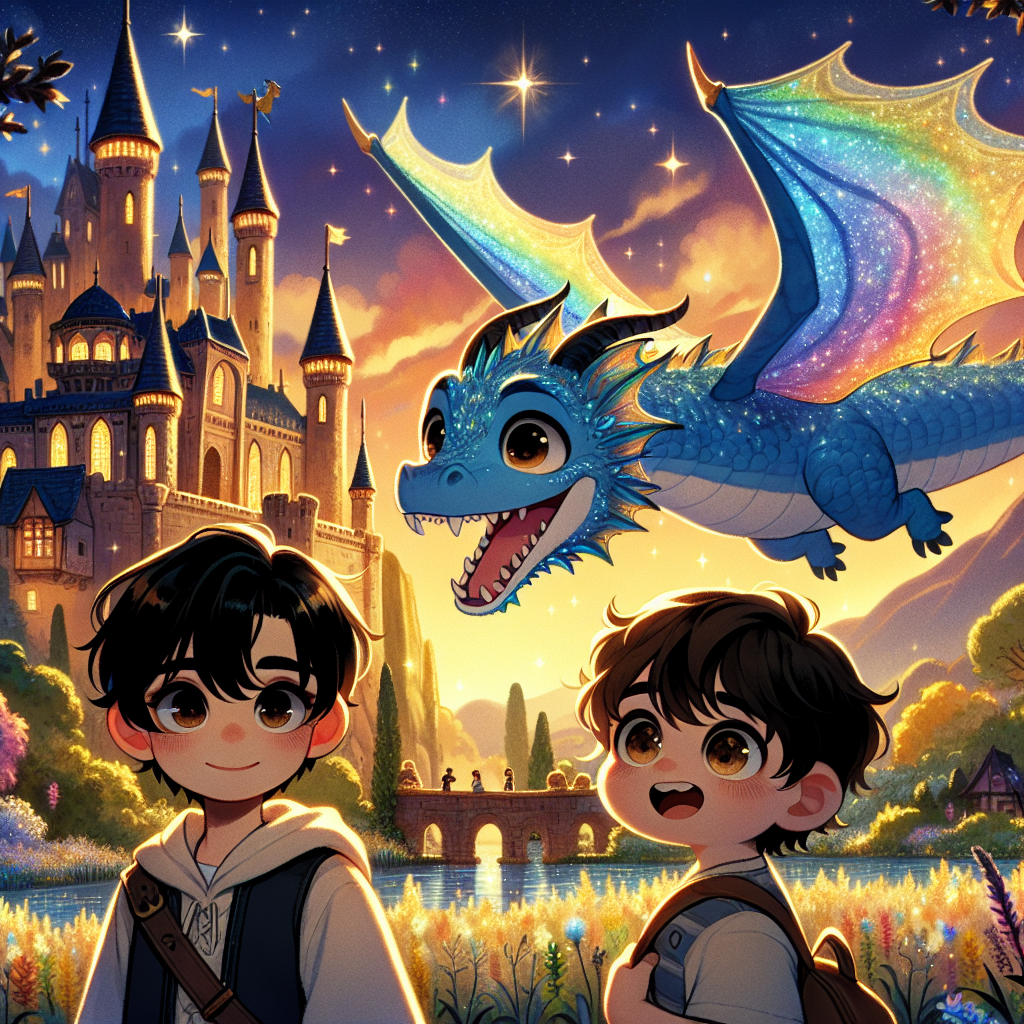 Once upon a time, nestled among ancient ruins, stood a dodger blue castle called Twinkle Castle. Twinkle Castle was no ordinary castle. It had 143 rooms that moved around every day, towers that sang the sweetest lullabies at night, and a moat filled with liquid starlight instead of water! Deep inside the castle lived a family of cloud dragons, who loved to listen to the lullabies and watch the stars dance. One sunny morning, Aarav and Lucas, two friends with very different interests, decided to explore the ruins. Aarav, who loved space and dinosaurs, was especially excited. He loved solving puzzles and finding hidden things. Lucas, who loved playing soccer and building, was just as eager to see what they would discover. "Wow! Look at that castle," Aarav exclaimed, pointing towards Twinkle Castle, its blue towers sparkling under the sun. "It's magical!" Lucas agreed, his eyes wide with wonder. Suddenly, they heard a soft "poof" sound, and a fluffy, blue violet dragon with glittery scales appeared before them. It was Frizzle, the Rainbow Dragon! Frizzle’s scales shimmered with all the colors of the rainbow. Instead of fire, Frizzle breathed out glitter! "Hello!" Frizzle said in a gentle voice. "My name is Frizzle, and I need your help!" Aarav and Lucas looked at each other, their hearts pounding with curiosity. "What's wrong?" Aarav asked. "The lullabies... the towers aren't singing their lullabies anymore," Frizzle explained, her voice filled with sadness. "And without the lullabies, the stars are dimming, and the cloud dragons are very sad." Lucas frowned. He didn't like seeing anyone sad, especially not a friendly dragon like Frizzle. "We'll help!" he declared. "What do we need to do?" Aarav was already thinking about the mystery. He loved solving puzzles, and this seemed like a very important one. Frizzle smiled, and a tiny trail of glitter floated from her nose. "The key to the lullabies is hidden somewhere in these ruins," she said. "You must find it and bring back the music!" Frizzle led them into the ruins. There, on the ground, was a puzzle. It was a dinosaur puzzle with missing pieces! "A dinosaur puzzle!" Aarav exclaimed. "I love dinosaurs!" "And I love puzzles!" Lucas added, ready to lend a hand. The first piece was a long neck, just like a Brachiosaurus. "We need to find all the pieces!" Aarav said, looking around. Aarav and Lucas searched, Aarav using his sharp eyes to look for the puzzle pieces and Lucas building small bridges to help them reach high places. They found a tiny, shiny claw, and a tooth. But they needed more. As they searched, they noticed that the ruins were filled with strange pathways. Some led to dead ends, others to hidden rooms. The air around them hummed with a faint energy, like the ruins were trying to tell them a secret. As they continued their search, the children came across an odd room. It had a door that led out, but there was no handle, and the door wouldn’t open. Lucas, ever the builder, had an idea. "Let's build a bridge!" he exclaimed, grabbing some stones and sticks from the ground. Aarav, using his puzzle-solving skills, realized the bridge needed to be a specific shape to fit a hidden groove. Lucas collected a couple of pieces of wood, and together, they constructed a small bridge that reached the door. Once the bridge was finished, they tried the door again, and it swung open! Inside the room, they found a small, glowing star-shaped key. Frizzle watched them, her scales shifting to shades of green and gold with excitement. "The key!" she exclaimed. "That's the key to the towers' music!" With the key in hand, they rushed back to Twinkle Castle. They found the towers, and as Aarav put the star-shaped key in a keyhole, the towers began to sing again, filling the air with beautiful melodies. The stars immediately began to twinkle brighter than ever before. The cloud dragons cheered and danced in the sky. Frizzle's scales sparkled with all the colors imaginable, and she breathed out a cloud of shimmering glitter that filled the ruins with joy. Aarav and Lucas looked at each other and smiled. They had solved the puzzle and restored the lullabies! "You did it!" Frizzle said, giving them a big, glittery hug. "Thank you, thank you both so much!" Aarav and Lucas were thrilled. They had worked together, used their different skills, and made a difference. As the sun began to set, Aarav and Lucas stood in front of Twinkle Castle. They felt proud of themselves. They had not only helped Frizzle and the cloud dragons but also discovered the magic of teamwork and the importance of working together. And as they walked away, they knew they would never forget the day they brought the starry song back to the ancient ruins and the magical Twinkle Castle.