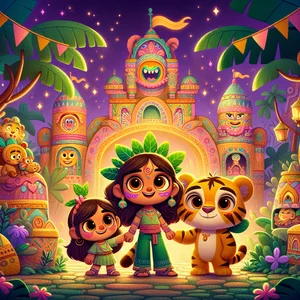 Deep within a land shimmering with laughter and wonder, stood the Laughing Castle. It wasn't just any castle; it was a place where the very stones seemed to chuckle, and the flags on the towers danced in the wind as if they were doing the tango. This was the setting for the most extraordinary quest undertaken by Tiko, the Jungle Explorer Tiger. Tiko wasn't just any tiger; he wore a bright green leaf hat, collected funny-shaped rocks, and could talk to vines, which helped him swing through trees with amazing speed. His current mission: to find the Lost Joy Gem, a gem said to hold all the world's happiness.