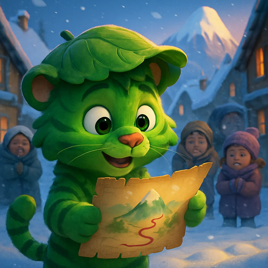 Tiko the tiger, explorer extraordinaire, adjusted his leafy green hat. It felt a bit droopy in the chilly air. He’d expected sunshine and tall trees, not a village buried in fluffy white snow! He missed the warm, humid air of his jungle home, the vibrant green vines that loved to swing him from branch to branch. In his paw, he clutched his most prized possession: a treasure map. But this map was special. It changed its mind like Tiko sometimes did when he saw a particularly funny-shaped rock. Today, it shimmered and showed a path to something called the Giggle Gem. The villagers scurried past, their faces tucked into their scarves, looking as cold and still as the icicles hanging from the eaves. No one was laughing. It was as if their giggles had been frozen solid. Tiko’s whiskers twitched. What if the Giggle Gem could bring the laughter back? What if it could warm their hearts like the jungle sun? He peered at his map. The usual swirling paths of his moods were replaced by a wiggly, wobbly line pointing towards the biggest, snow-covered mountain he had ever seen. It looked very, very tall and very, very white.