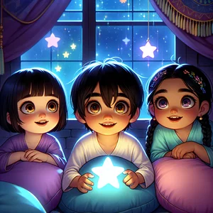 Far, far away, in the inky blackness of space, there was a space station that sparkled like a giant disco ball. Inside, three children were having a very hard time sleeping. It was bedtime, but their eyes just wouldn't close. And in the big, beautiful sky, there was a blue-violet star named Twinkle. Twinkle wasn't just any star; she was a sleepy star, and tonight, she felt sleepier than ever! Her soft glow changed colors, sometimes pink, sometimes gold, and sometimes a gentle green. She also had a special pouch where she collected yawns—a pouch that was almost overflowing! Tonight, Twinkle decided she was too sleepy to stay in the sky, so, very gently, she began to fall.