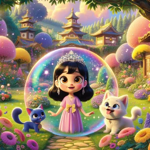 In a Secret Garden, where flowers sang sweet songs and pathways sparkled like scattered gems, lived Zuzu the Bubble Cat. Zuzu wasn't just any cat; she floated in a bubble, a deep sky blue like the twilight sky, and created magical bubbles that popped into songs! Each bubble held a different tune, from a bouncy polka to a soothing lullaby. Her fur changed colors depending on the music around her, and she slept on cloud pillows. One day, while Zuzu was playing a merry tune, she heard a sad sigh.