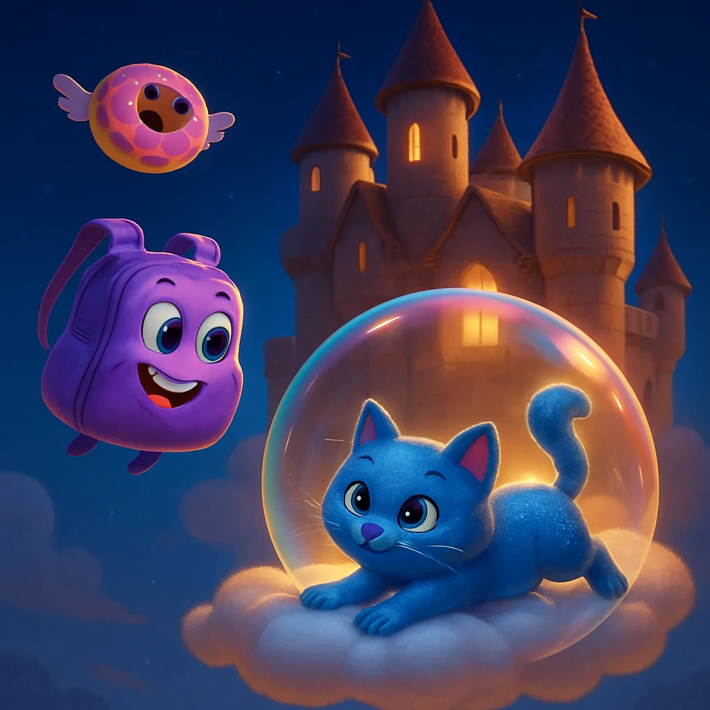 Suddenly, a cheerful, violet glow pulsed from below. "Zuzu! Zuzu! Are you awake?" It was Blinky, Zuzu's best friend and a very magical backpack. Blinky wasn't just any backpack; he could store anything, from a pile of shiny pebbles to an entire bouncy castle! His violet exterior gleamed as he floated up to Zuzu's bubble. "I'm so excited!" Blinky chirped. "You said today we might make a new song! I've been organizing my pockets all morning. I even made sure the happy marbles are next to the funny socks, just in case!" Zuzu purred softly, a happy, rumbling sound. Outside the castle windows, the misty morning sky began to clear, and warm, golden sunbeams peeked through. Blinky's fur, which was usually a soft, shimmering violet, seemed to glow even brighter. "That's right, Blinky!" Zuzu meowed, her voice like the tinkling of tiny bells. "Today, we're going to create a grand, new melody. A song of pure joy and sunshine! I have an idea for the most beautiful bubble tune ever!" Blinky pulsed with excitement. "Ooh! And if we need to celebrate, I've got that bouncy castle tucked away, ready to go! Just imagine, bouncing on clouds while listening to your new song!" Zuzu’s tail flicked, already imagining the melody.