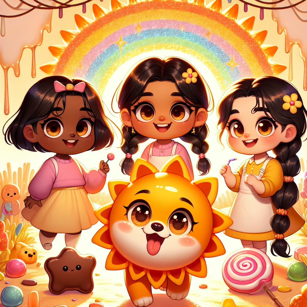 En lo alto de una montaña reluciente, hecha de dulces de todos los sabores, vivían tres amigos muy especiales. Estaba Sunny, la cachorra nube, una bolita de alegría con pelaje de algodón de azúcar y un corazón que hacía llover arcoíris. Luego, estaba Kiki, la unicornio de maíz dulce, con una melena que sabía a todos los sabores de algodón de azúcar y un cuerno que convertía cualquier cosa en caramelo. Y finalmente, estaba la Capitana Pompón, una pirata animadora con botas brillantes y un barco hecho de pastelitos. ¡A Azal, Priya y Harper les encantaba escuchar sobre estos amigos!