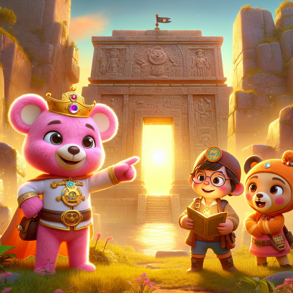 Un día soleado, mientras el Príncipe Oso saboreaba su té de miel, llegó una invitación especial. Era una carta enrollada y atada con una cinta dorada, enviada por Angus el Aventurero, un explorador de pelaje naranja y ojos curiosos, siempre acompañado de sus gafas redondas y su bastón de confianza. En la carta, Angus describía un mapa misterioso, lleno de símbolos y acertijos, encontrado en un cofre antiguo. El mapa llevaba a las Ruinas Olvidadas, un lugar lleno de secretos y leyendas.