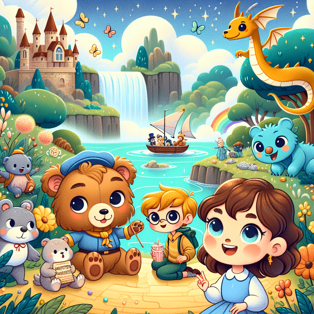 En una isla escondida, un lugar donde los árboles cantaban canciones de cuna y las rocas brillaban con colores de arcoíris, vivían amigos muy especiales. Estaba Bearon, el oso real de pelaje azul celeste, con su corona y su cetro de miel. Siempre organizaba fiestas de té y sabía cuándo iba a llover por lo esponjoso que se le ponía el pelo. Luego estaba Frizzle, el dragón arcoíris, que respiraba purpurina y dejaba rastros de colores allá donde iba. ¡Era la mejor amiga para un día de juegos! Y también estaba Rollo, el erizo rodante, que siempre llevaba un bolsillo lleno de bocadillos en su cinturón. ¡Podía correr tan rápido que nadie lo alcanzaba!