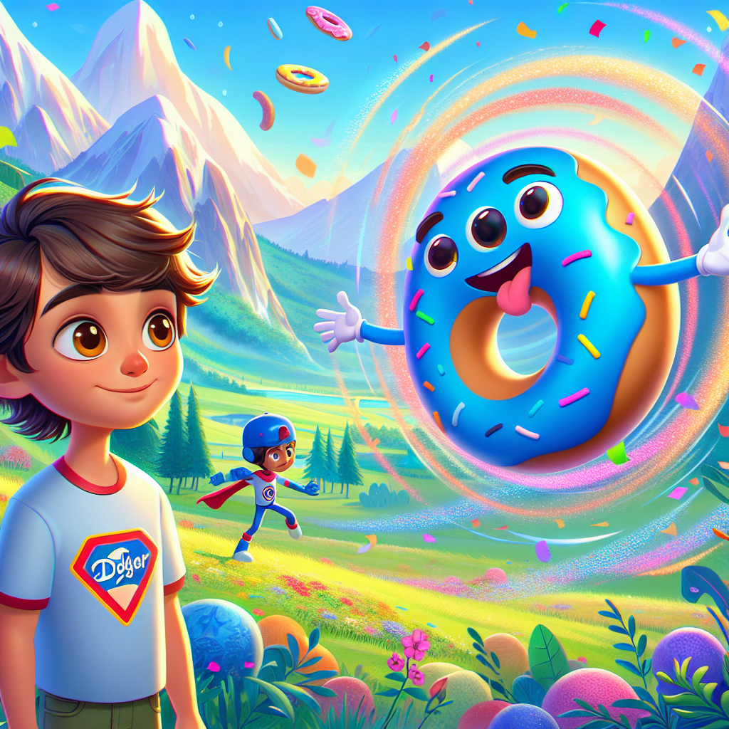 En lo alto de una montaña majestuosa, donde las nubes parecían algodones de azúcar, vivía Dizzy, la Dona Voladora. Dizzy era de un azul celeste, como el cielo en un día perfecto. Le encantaba girar y girar, con su agujero en el medio actuando como un portal secreto a la Dimensión de la Risa. Y no se diga de sus chistes… ¡eran los más tontos que se pudieran imaginar! Pero lo más especial de Dizzy eran sus chispas de confeti. Dependiendo de lo bueno que fuera su chiste, ¡las chispas cambiaban de color!