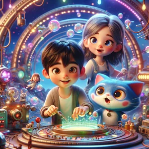 Zuzu, flotando en su burbuja, sopló burbujas musicales, cada una con una melodía diferente. A Isabelle le encantaba, pues le recordaban a los unicornios y a la magia. Wei, por otro lado, estaba más interesado en la gran antena de comunicaciones de la estación. Tenía una estructura compleja que a Wei le recordaba a sus juegos de construcción.