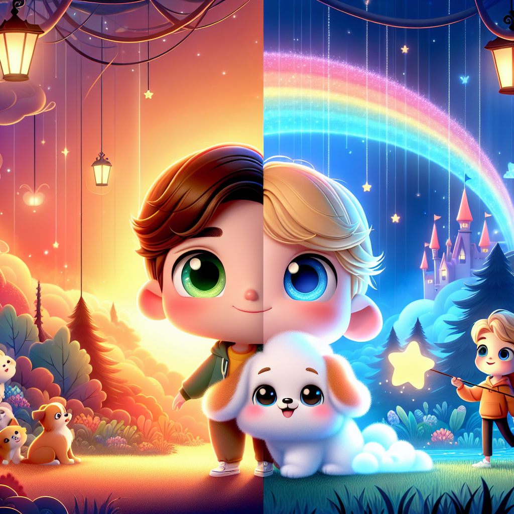 En lo profundo del Bosque Sombrío, donde los árboles susurraban secretos y las sombras bailaban al son del viento, vivían dos amigos muy especiales: Sunny, el Cachorro Nube, y Twinkle, la Estrella Soñolienta. Sunny era un cachorro peludo de color naranja rojizo, cuyo pelaje parecía hecho de algodón de azúcar. Cada vez que ladraba, sus ladridos sonaban como pequeñas campanillas, y a su paso dejaba un rastro de arcoíris. Twinkle, por otro lado, era una estrella azul violeta, suave como la seda, que descendía del cielo para arropar a los niños que no podían dormir. Tenía un saco mágico donde guardaba los bostezos y podía crear almohadas de ensueño que mostraban películas felices toda la noche.