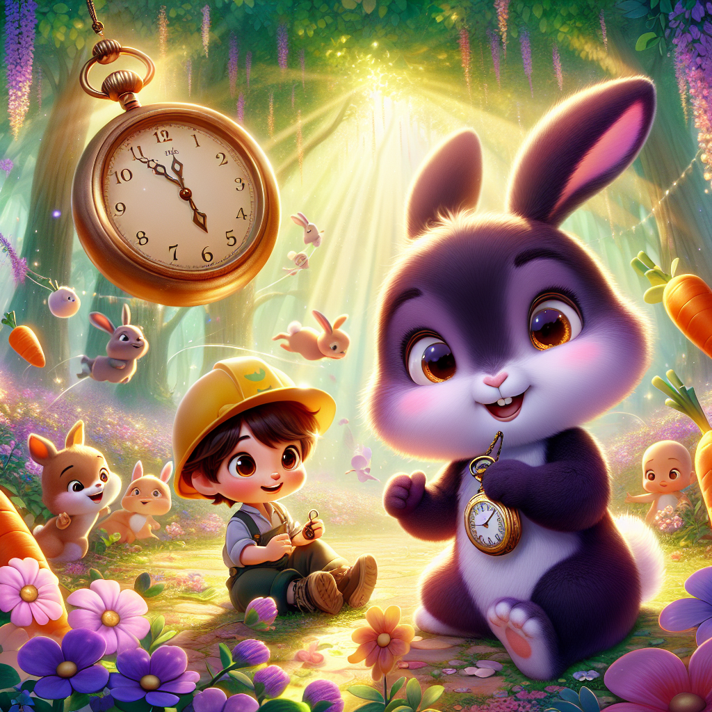 En el Bosque Encantado, donde los árboles cantaban canciones y las flores bailaban con el viento, vivía Tockie, el Conejo del Tiempo. Tockie era un conejito esponjoso de color violeta oscuro, con una habilidad extraordinaria: ¡siempre sabía la hora exacta! Tenía una colección de zanahorias que indicaban el tiempo. Cada zanahoria, con su peculiar forma y color, te decía qué hora era. Algunas tenían forma de trenes, otras parecían camiones de construcción, y una en especial, con forma de estrella, era el Reloj de Zanahoria de Medianoche, que brillaba con una luz mágica.