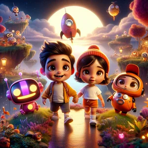 En las Islas Flotantes, donde las nubes eran suaves como algodón de azúcar y los puentes arcoíris conectaban islas de todas las formas y tamaños, vivían tres amigos muy especiales. Estaba Rocket Pop, una cápsula espacial azul cielo que brillaba de color rosa cuando se emocionaba. Le encantaba explorar las galaxias brillantes y coleccionar arcoíris espaciales en su compartimento secreto. Luego estaba Boop el Robot Lunar, un pequeño robot rojo que hablaba con "bips" y adoraba los abrazos. Boop tenía una antena que capturaba los sueños de los niños dormidos y proyectaba constelaciones de estrellas con sus ojos. Y por último, pero no menos importante, estaba Angus el Aventurero, un explorador naranja y peludo, con gafas redondas y un bastón de madera. Angus amaba encontrar tesoros escondidos y siempre llevaba consigo un mapa y una hoja de la suerte en su sombrero.