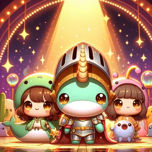 En una estación espacial reluciente, donde las estrellas parecían confeti dorado, vivía Noodle, el Caballero Narval. Noodle era un narval valiente y honorable, con una armadura hecha de conchas marinas encantadas y un casco brillante. ¡Pero lo más especial era su cuerno! Cuando estaba cerca de un tesoro, el cuerno de Noodle brillaba con una luz verde esmeralda.