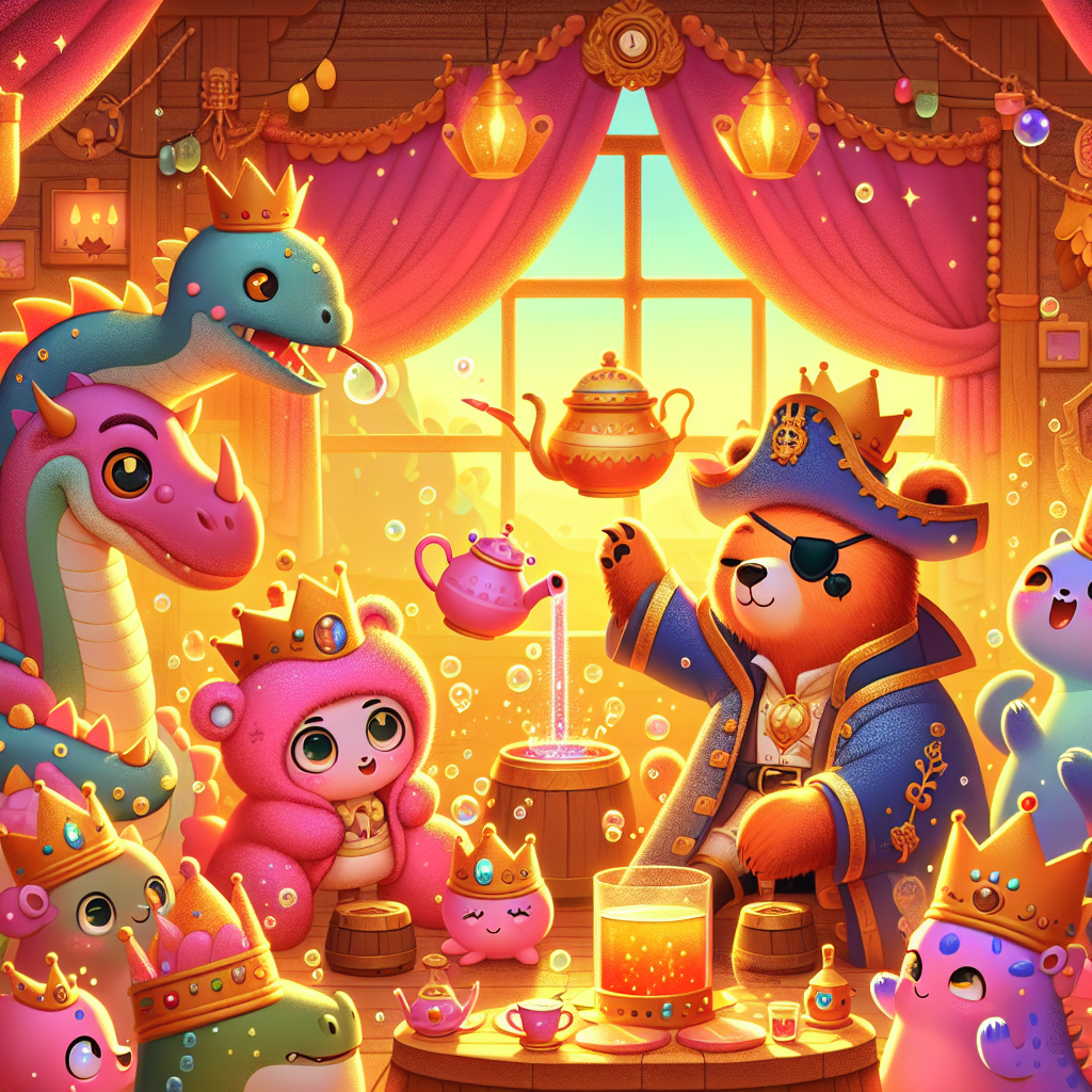 En la guarida del dragón, en lo alto de una montaña rosa, vivía el Príncipe Oso Pirata. Tenía una corona de oro brillante y un parche en el ojo, porque los piratas, ¡son geniales! Su guarida era una cueva acogedora, llena de tesoros y, lo más importante, ¡37 coronas diferentes! Cada una era especial, desde la Corona del Valiente hasta la Corona del Dormilón. Fuera, el sol brillaba sobre un paisaje vibrante, con árboles que parecían helado de fresa y ríos de limonada. Al Príncipe Oso Pirata le encantaba su hogar y amaba aún más a sus amigos. Era conocido por su amabilidad y por sus abrazos protectores.