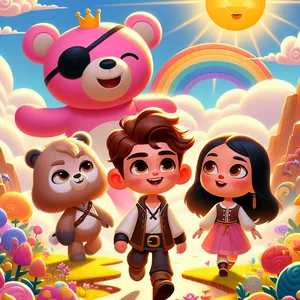 En el corazón del desierto, donde el sol brillaba con más fuerza, se encontraba un oasis mágico. Allí vivía el Príncipe Oso Pirata, un oso valiente con una corona dorada y un parche en el ojo, ¡y le encantaban los abrazos! Su pelaje era de un color rosa intenso y siempre estaba listo para proteger su reino con amabilidad. Tenía una colección de 37 coronas diferentes y amaba el té de miel. Un día, mientras observaba sus coronas (que extrañamente, no brillaban tanto como de costumbre), notó algo inusual: una sombra extraña se cernía sobre el oasis. Era una sombra oscura, diferente a la de las palmeras o las rocas. ¡Qué misterio! Su amigo, Sunny, la Cachorra Nube, estaba allí también. Sunny era una cachorra peluda de color naranja rojizo, que podía rebotar entre las nubes y hacer que el sol siguiera a donde fuera. Sus ladridos sonaban como pequeñas campanillas. Sunny siempre estaba alegre y lista para jugar, pero ese día, incluso sus ladridos eran menos frecuentes.